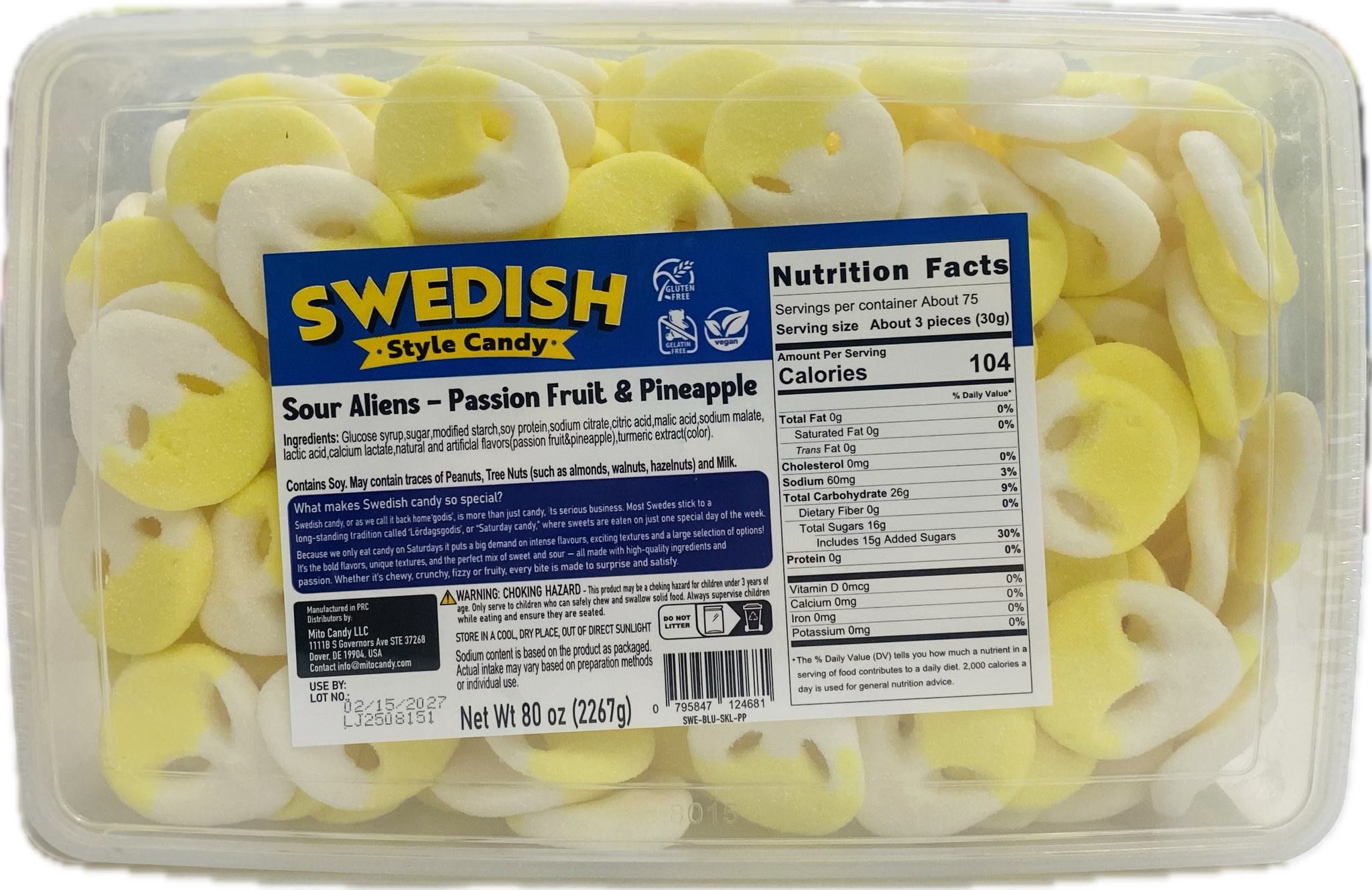 Discover the Swedish candy sensation that's captivating candy enthusiasts everywhere! These vibrant sour Alien candies combine mallow tart Passionfruit and Pineapple flavors in one irresistible treat. Each piece delivers an exciting contrast of pucker-worthy sourness followed by bright fruit notes that keep you reaching for more. The iconic Alien shape makes them instantly recognizable and Instagram-worthy. At 5lbs, this bulk package is ideal for resellers, party planners, or anyone who can't get enough of this trending Scandinavian favorite. Join the viral movement and experience authentic Swedish candy craftsmanship today!